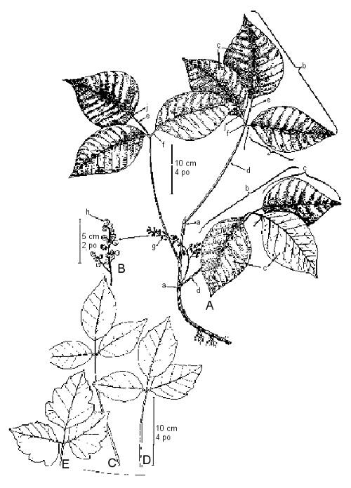 “Leaflets three – Let it be!” Each leaf of poison-ivy consists of three leaflets so the leaf is said to be “compound”. (See bracket marked “b” in Figure 3A for one complete compound leaf and bracket and arrows marked “c” for individual leaflets.) The stalk (e) of the middle leaflet is longer than the stalks (f) of the 2 side leaflets. All 3 leaflet stalks (e and f) are joined together at the tip of one much longer stalk (d) which is called the petiole. The other end of the petiole is attached to the woody stem at a node or “joint” (a). There is only one petiole at each node and, when there are several leaves they usually alternate from one side of the stem to the other at successive nodes.